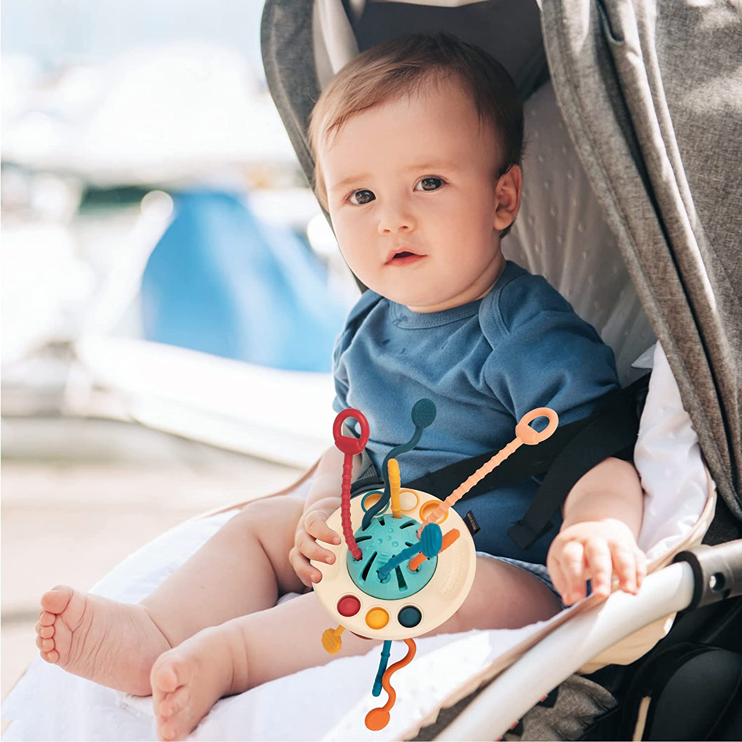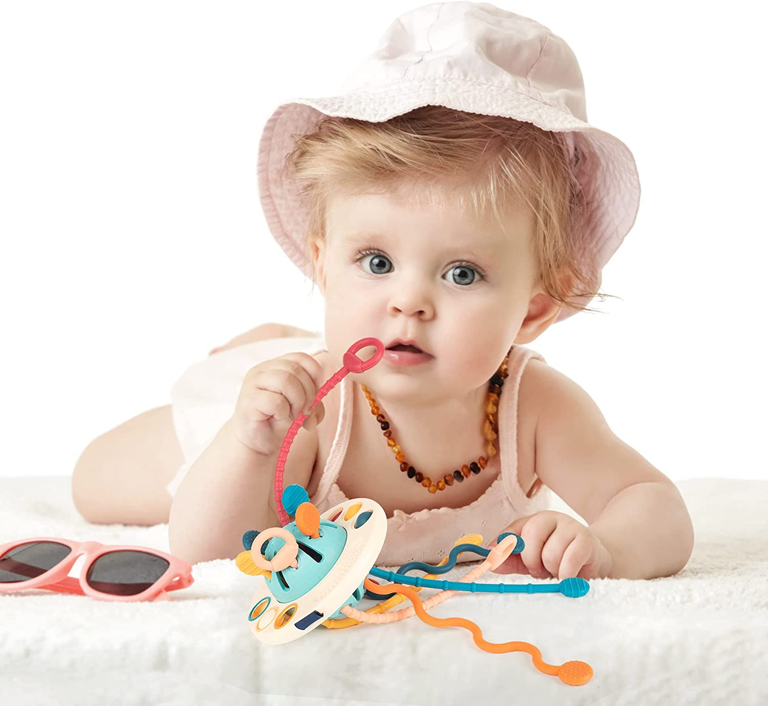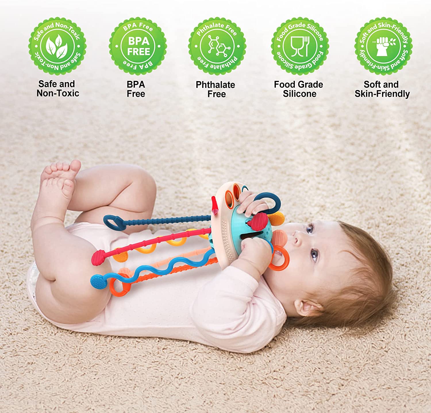 👾 100% Safe Material: This funny puller string interactive toy is made with food-grade silicone and ABS,100% safe material, Non-toxic, BPA, and phthalate free. Easy to clean. The food-grade silicone toys can relieve the baby’s discomfort during teething, soothe the baby’s emotions, and let the baby chew.