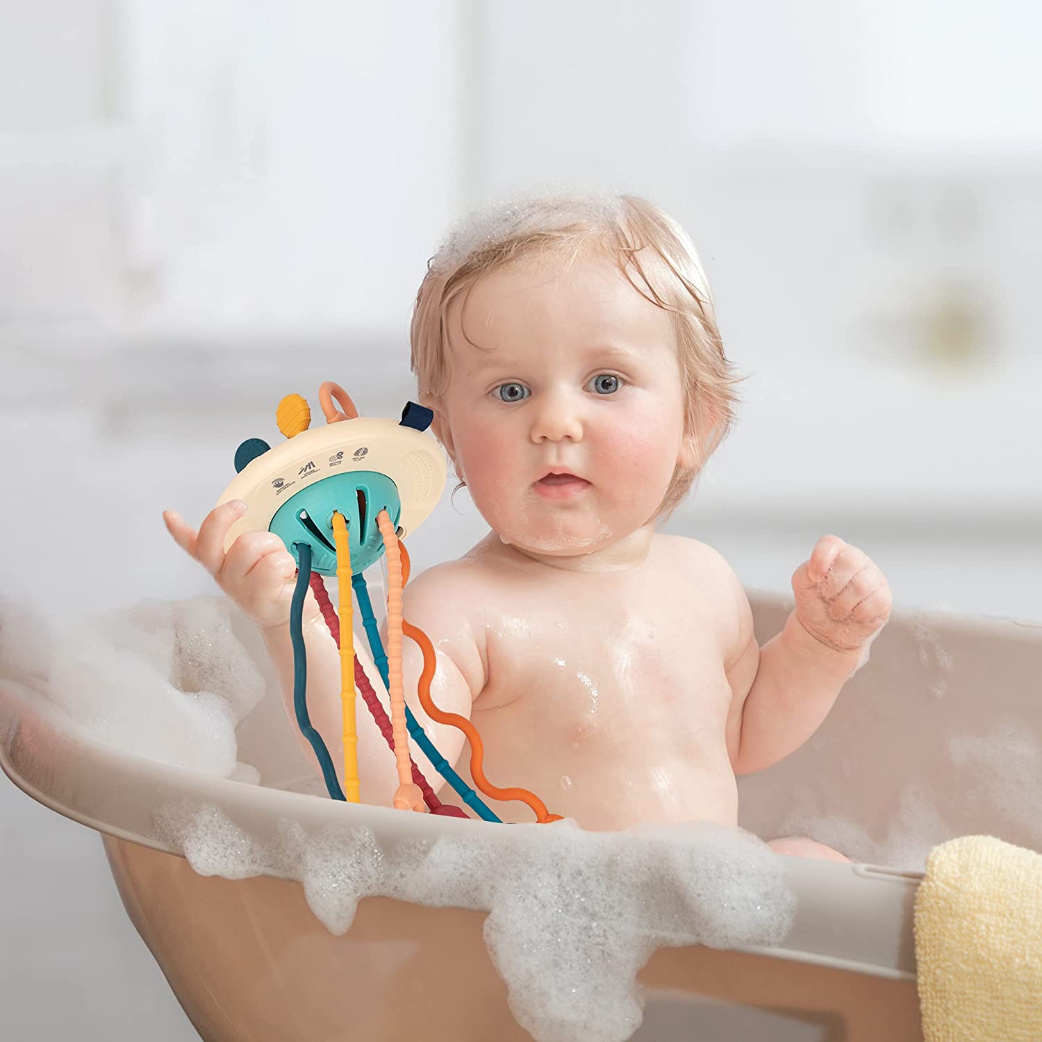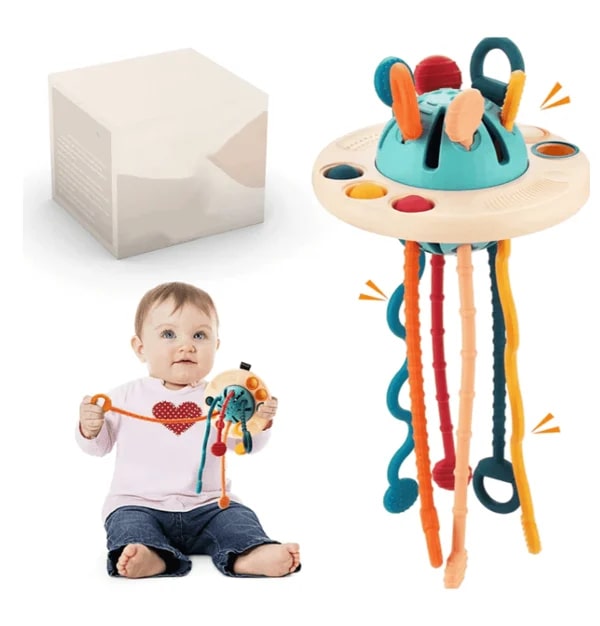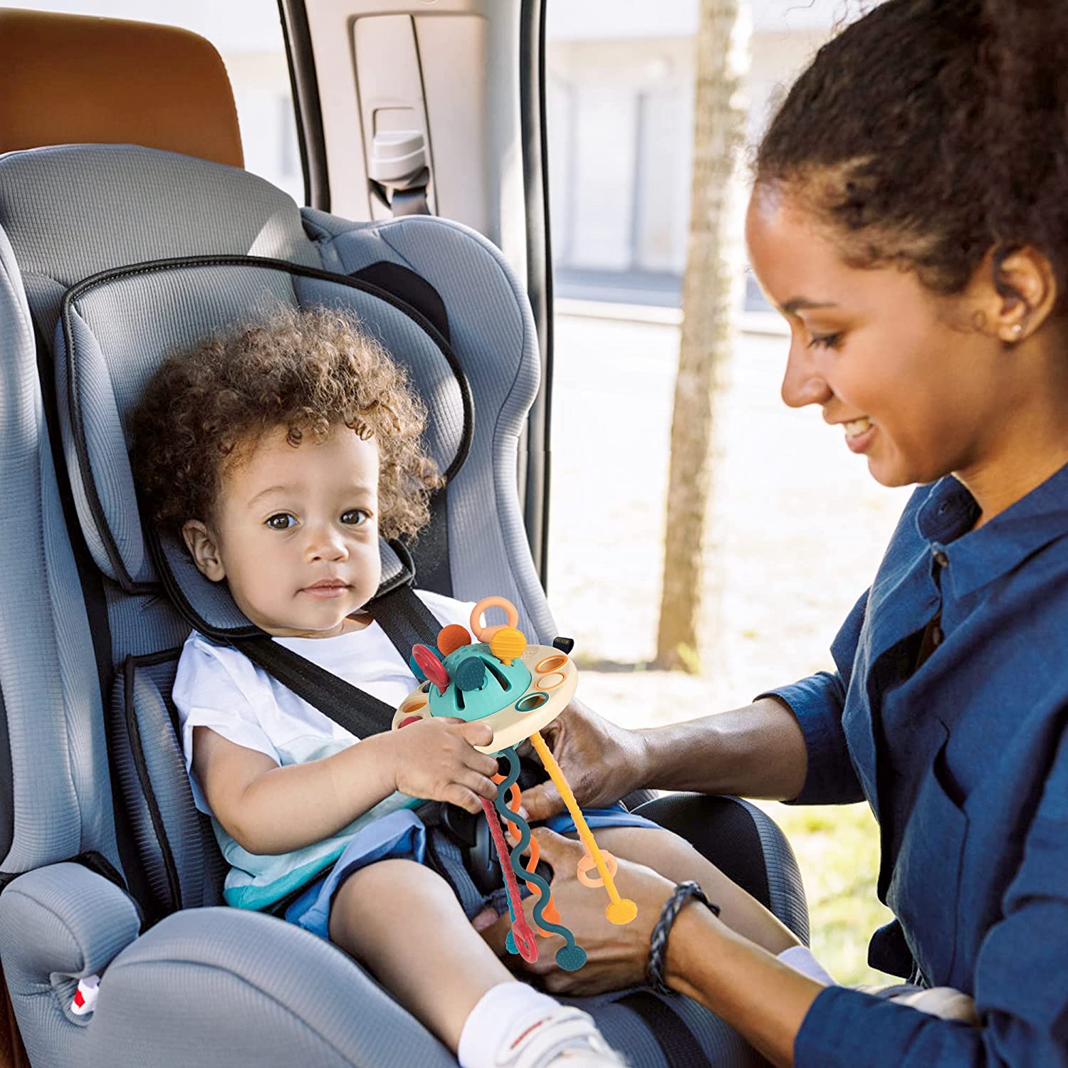 👾 100% Safe Material: This funny puller string interactive toy is made with food-grade silicone and ABS,100% safe material, Non-toxic, BPA, and phthalate free. Easy to clean. The food-grade silicone toys can relieve the baby’s discomfort during teething, soothe the baby’s emotions, and let the baby chew.