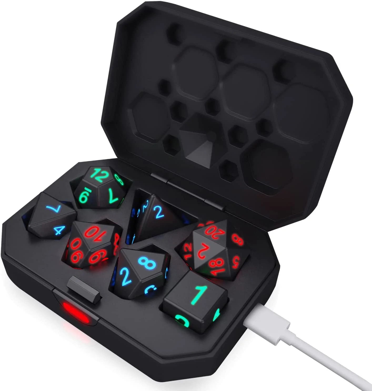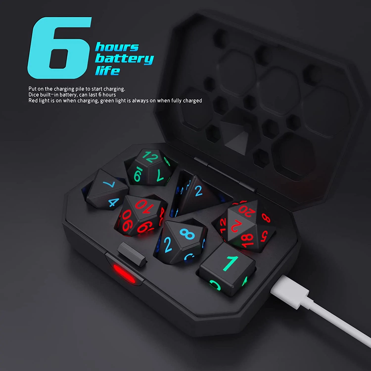 Our upgraded electronic dice set automatically light up and go out when collisions or rolls occur. The polyhedral dice set comes with a charging bin that charges for 2 hours and continues to glow for 6 hours and can be used multiple times.