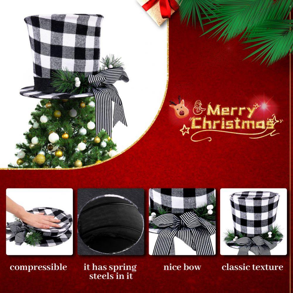 Red and black top hats with lattices, bows and ribbons. The unique hats can be used as tree top decorations or as holiday decorations.