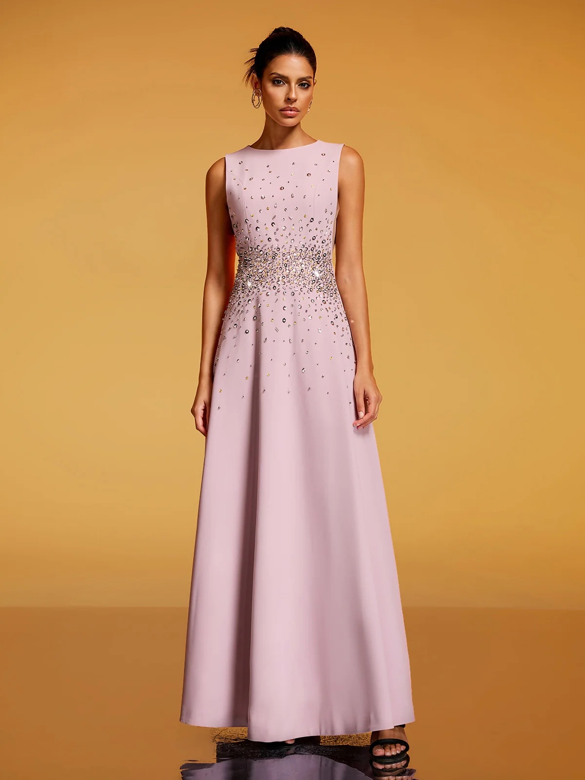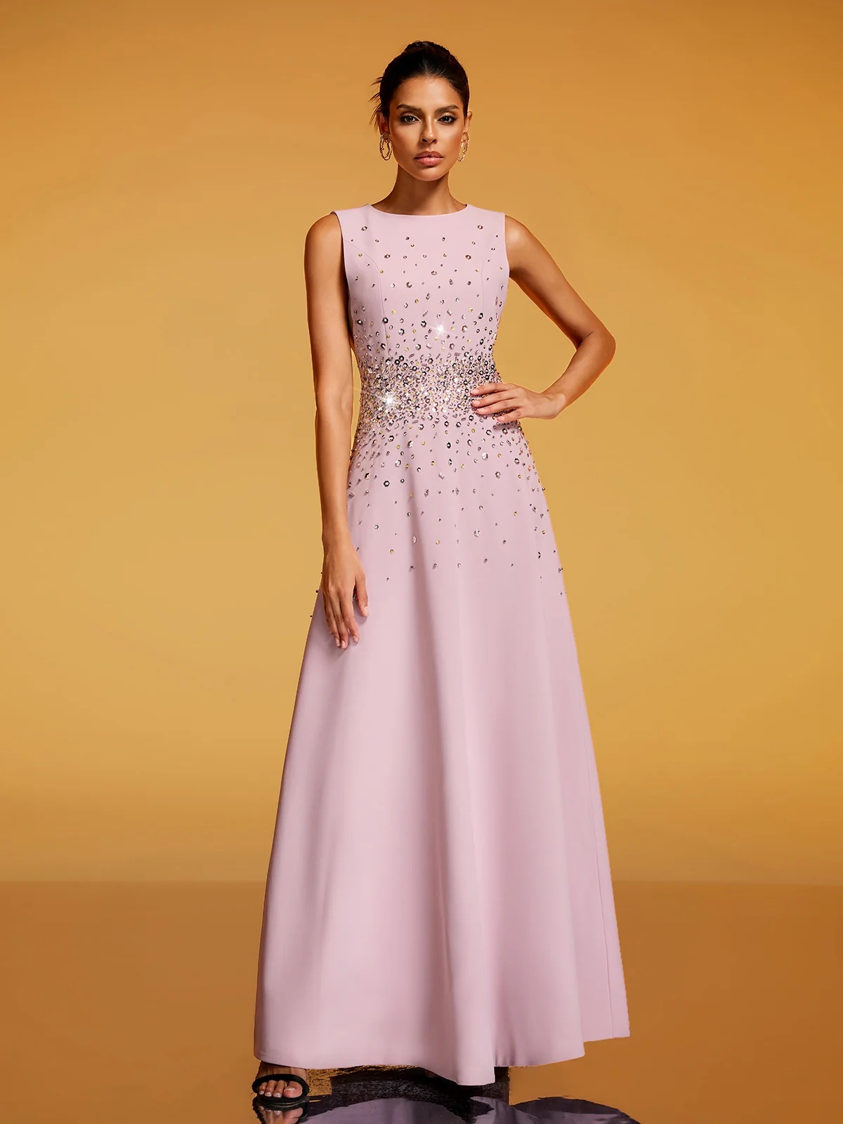 Elevate your evening look with the Felan Sleeveless Rhinestone Maxi Dress. This stunning floor-length gown features delicate rhinestone embellishments that catch the light beautifully, creating an eye-catching sparkle perfect for special occasions. The sleeveless design offers a sophisticated, timeless silhouette that flatters any figure. Crafted for comfort and elegance, this maxi dress transitions seamlessly from formal events to upscale celebrations. Make a memorable entrance in a dress designed to turn heads.