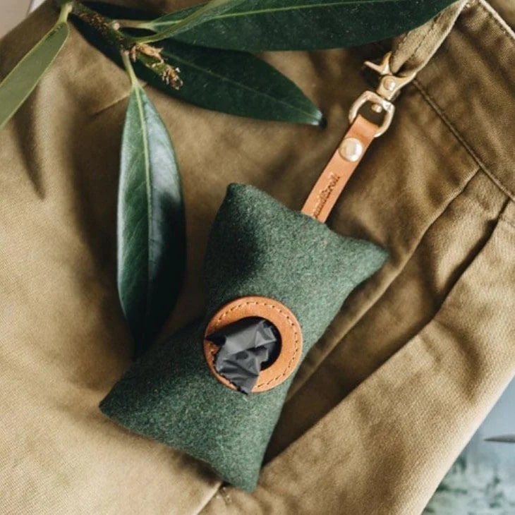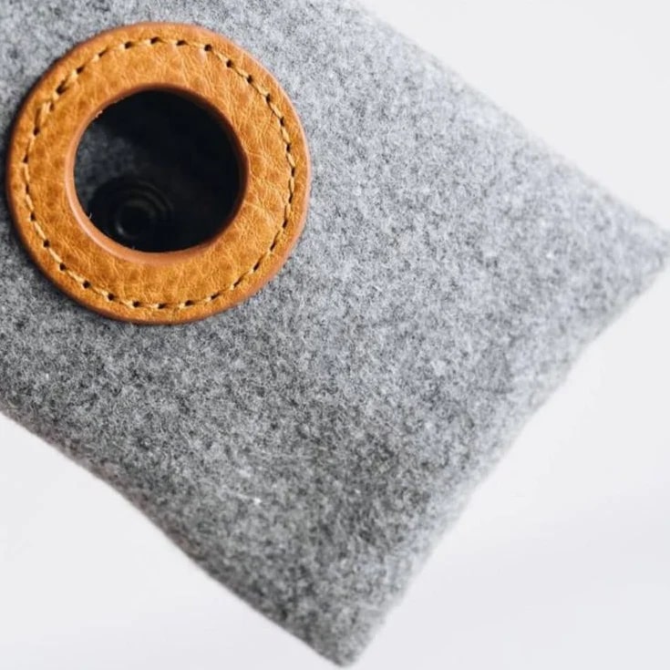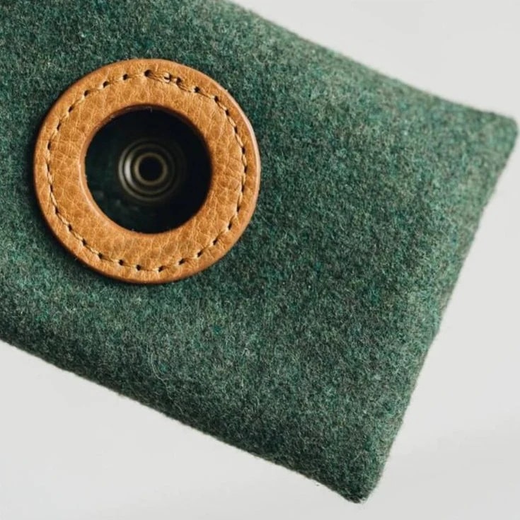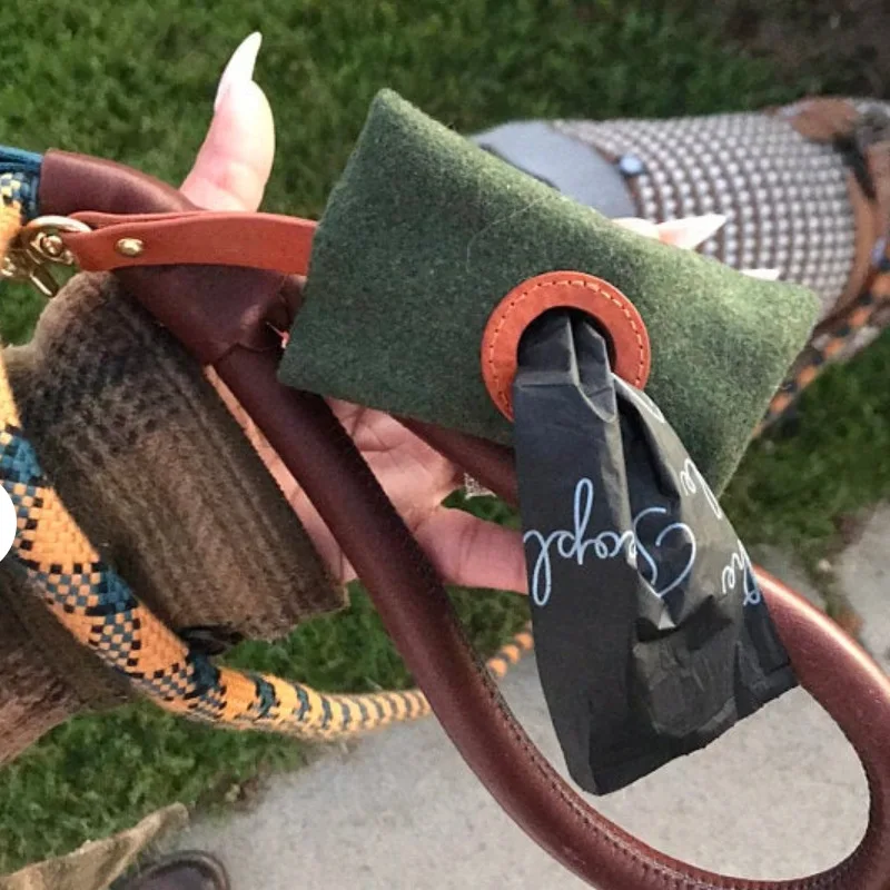 This unique solid color dispenser style your outdoor needs and sets your hands free, cleaning up after your dog while on walks easy with this Felt Waste Bag Dispenser. It secures easily to the handle of your leash or waist belt for easy carrying.