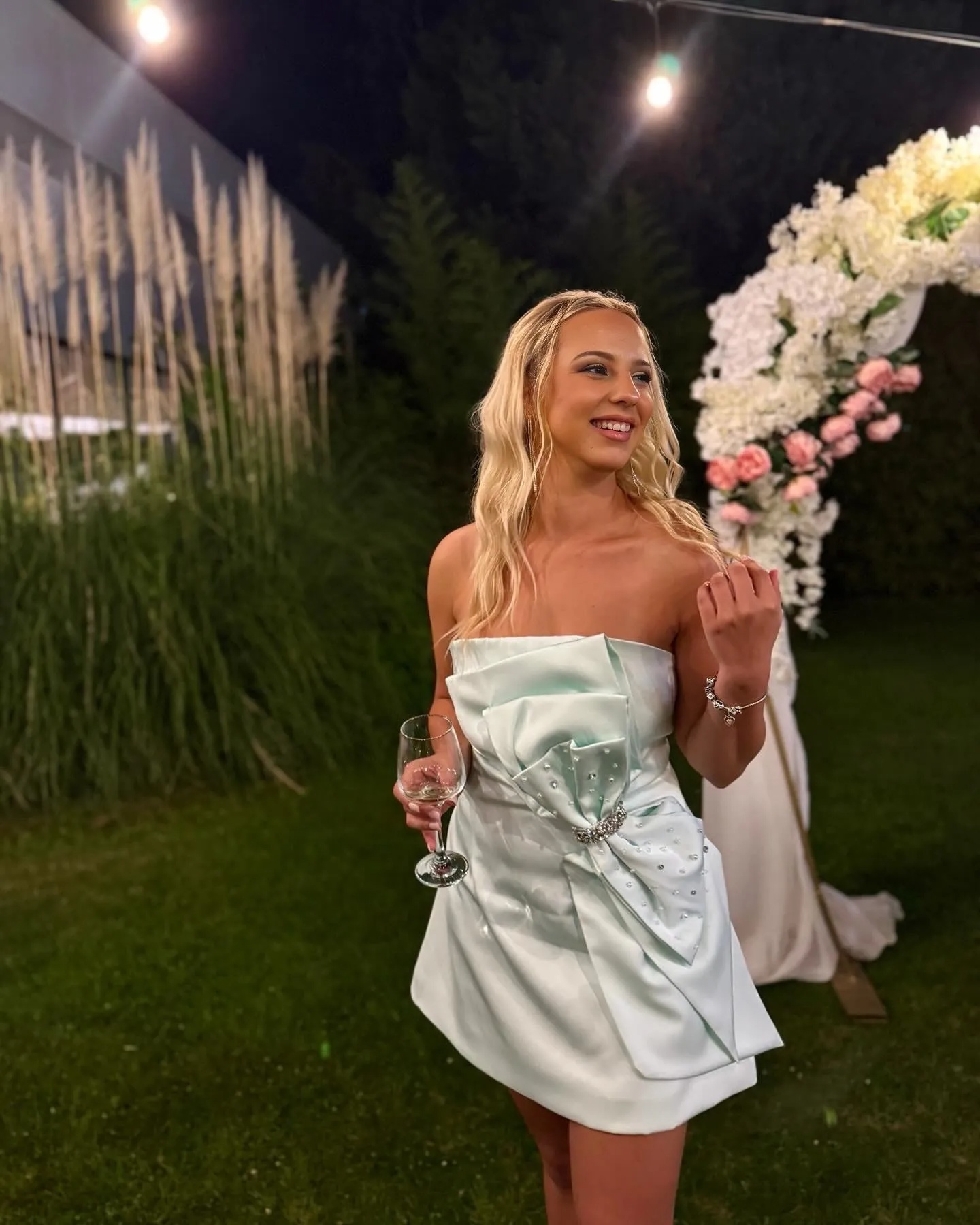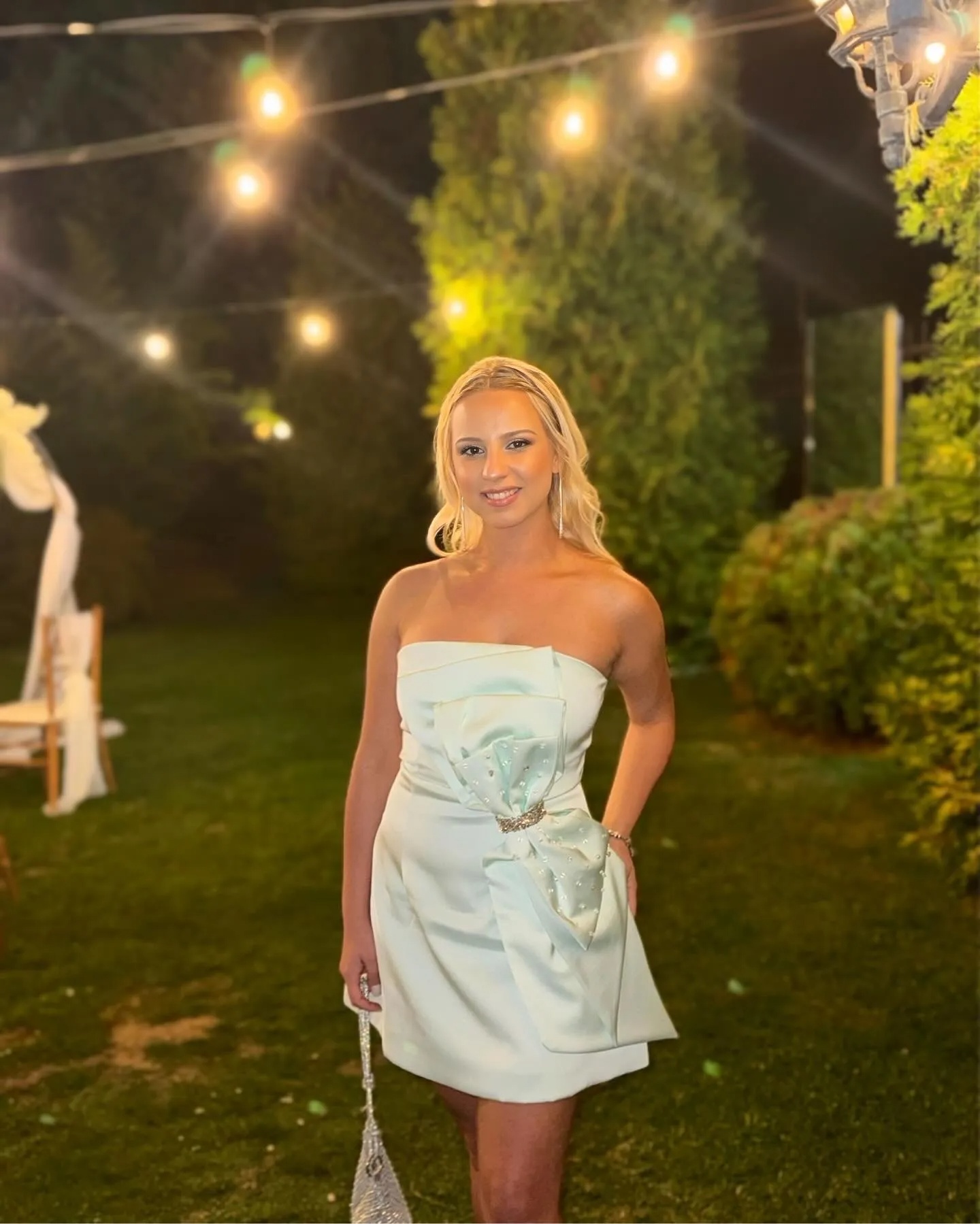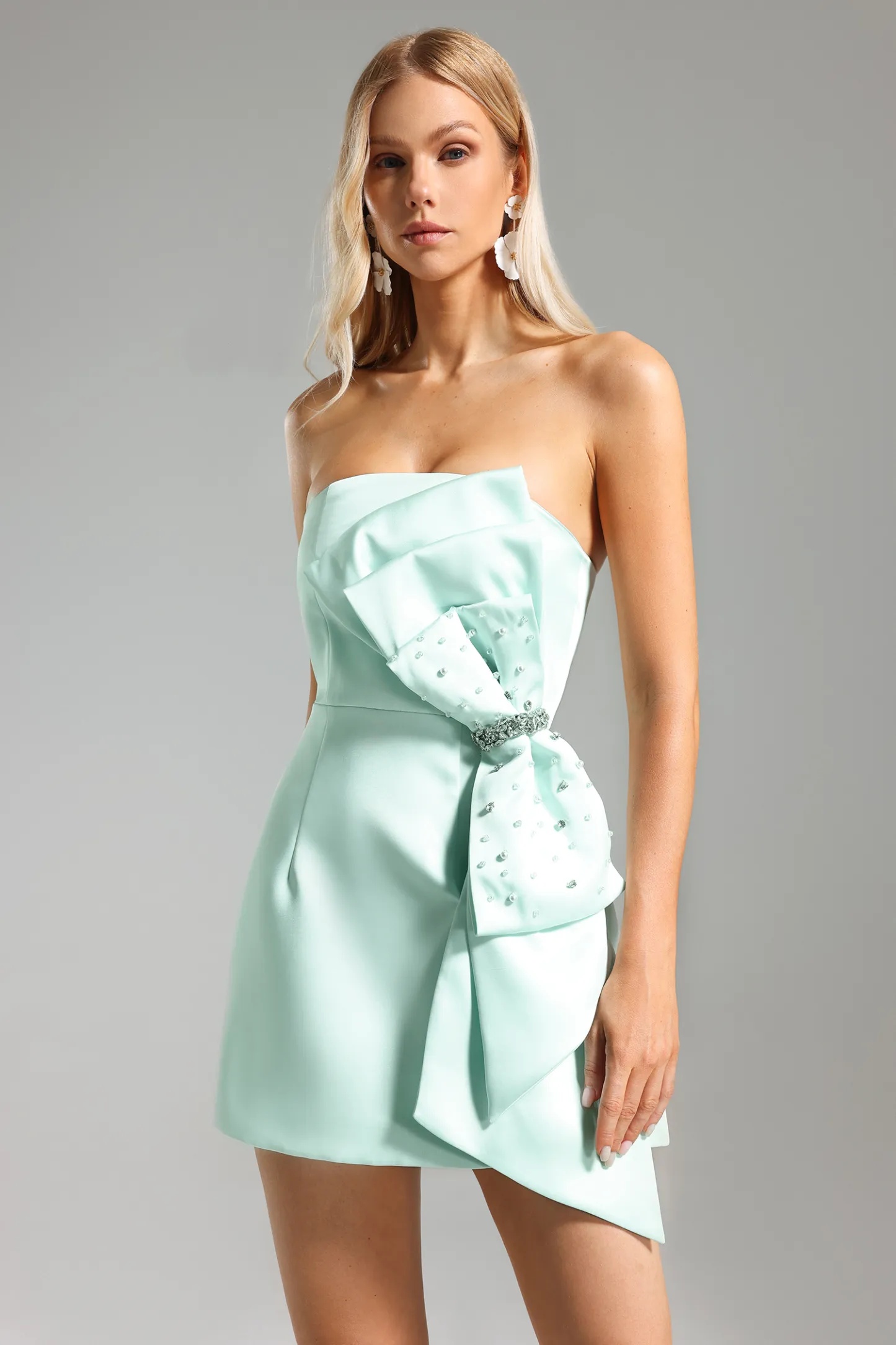 Dazzle in the Filasy Diamante Bow Mini Dress, a stunning piece that combines elegance with a touch of sparkle. This chic mini dress features a refreshing mint hue that stands out beautifully, complemented by a statement diamante bow at the front that adds a glamorous focal point. The strapless design showcases your shoulders, while the fitted silhouette flatters your figure, making it perfect for parties, nights out, or special events where you want to make a lasting impression.
