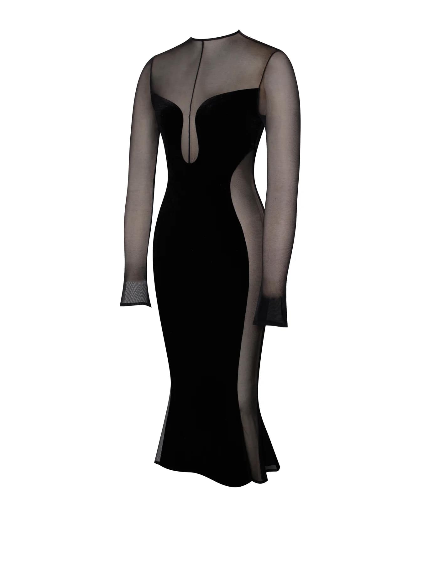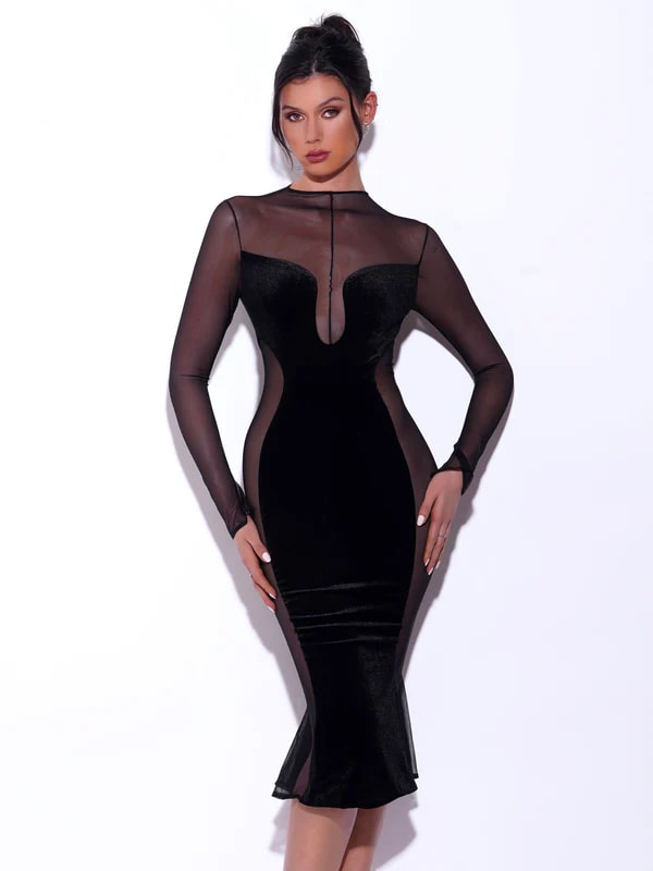 Our Zarife Dress has full sleeves and mesh detailing in a romantic full-length design. This dress is constructed from luxurious velvet. Style with heels for a chic look!