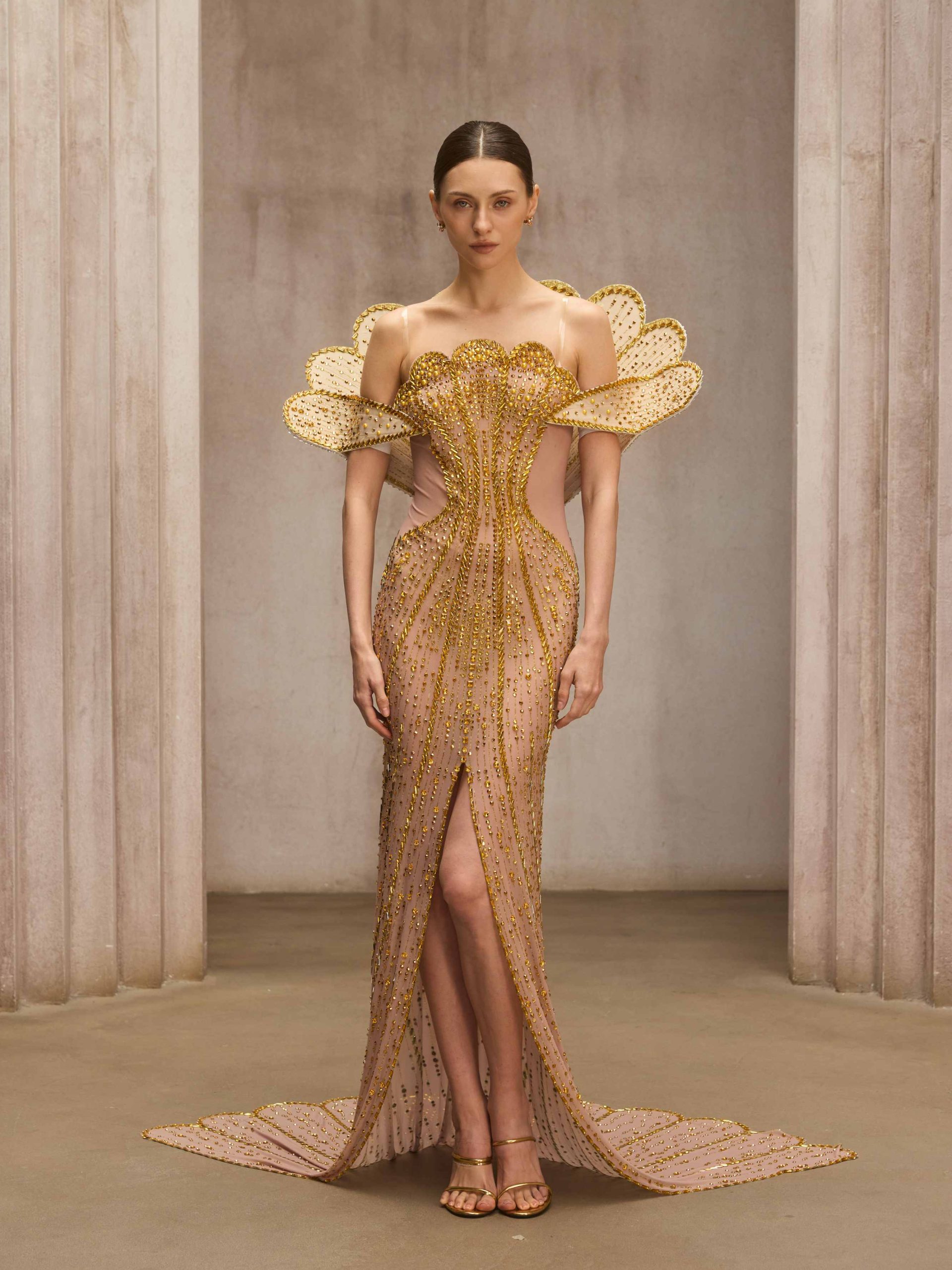Nesvor Rhinestone Mesh Split Maxi Dress In Gold